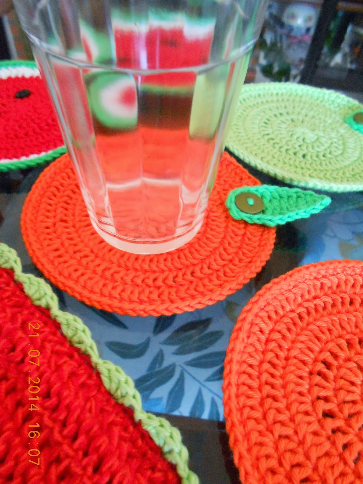 Seis lindos porta copos de crochê em formato de frutinhas. Limão , laranja ou melancia?